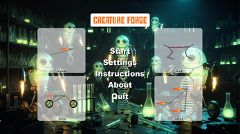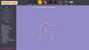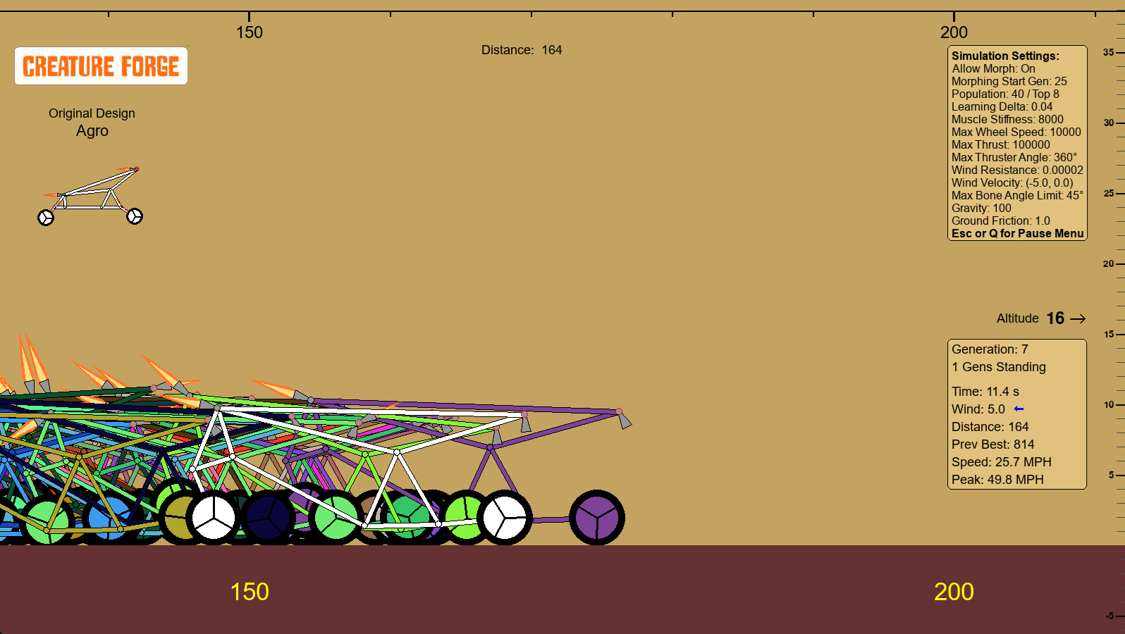 Creature Forge - Design and Evolve bizarre creatures from bones, muscles, wheels and rockets, then watch generations of neural-network-controlled offspring learn to race across a physics world. Creature Forge lets you hand-craft weird biomechanical monsters with AI-controlling neural networks, tweak gravity/wind/friction/thrusters and many other variables, then watch natural selection turn your awkward first designs into surprisingly capable (or hilariously disastrous) racers. Morphing Mode: Bones stretch/shrink and wheels resize via tiny mutations, turning your rigid blueprint into wildly adaptive mutants. Don't allow Morph to keep 'em true to your design, or unleash the chaos! 🚀🦵 Hand-design the starting body → tweak gravity, wind, friction, thrust power → evolve 40+ creatures per generation → laugh/cringe/cheer as the best designs slowly become less terrible.